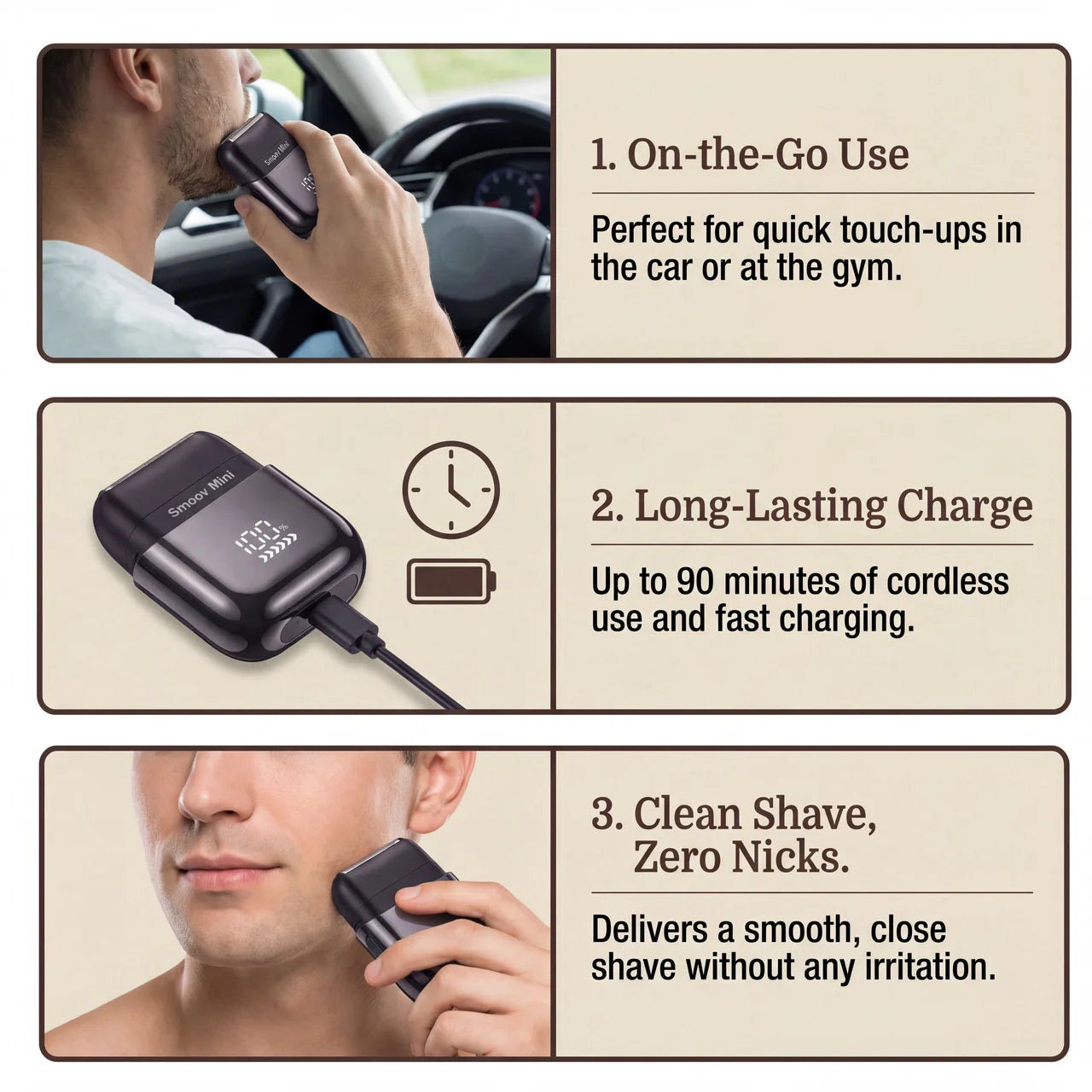 Most electric shavers are bulky, loud, leave hair all over your sink, and aren't built to travel. Ours is pocket-sized, whisper-quiet, and catches every hair as it shaves — so you can use it in your car, at your desk, in a hotel room, or anywhere else without the mess. It's not a replacement for your bathroom routine; it's a shave that goes wherever you do.